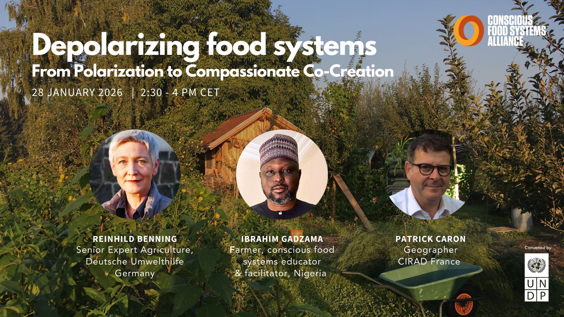 Hosted by UNDP’s Conscious Food Systems Alliance (CoFSA), this interactive dialogue will bring forward powerful stories from the frontlines of food system conflict and cooperation. Through case studies and breakout conversations, speakers will explore what it takes to navigate polarization: what works, what’s challenging, and how inner capacities like deep listening, patience, and curiosity can open new pathways for collaboration.